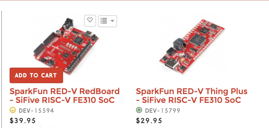 <@almindor:matrix.org> wrt. sifive there's a hifive1 clone called redv from sparkfun (using e310 almost identical clone on the board side as well) that I just got